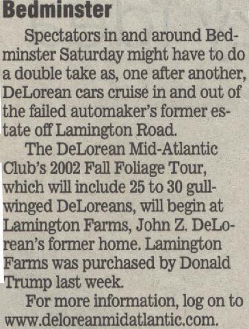 Many owners had driven from far away to attend the event for one very special reason. Our tour this year was going to be starting off from none other than the former John Z. DeLorean estate in Lamington, NJ! The estate was recently purchased by Donald Trump, with plans to re-develop the 450+ acre land into a golf club, equestrian center, and private estates. This meant that it would be the last time we would ever be able to have this opportunity for such an historic gathering. This was most likely going to be the first and last time that this many DeLoreans would be on the estate grounds.