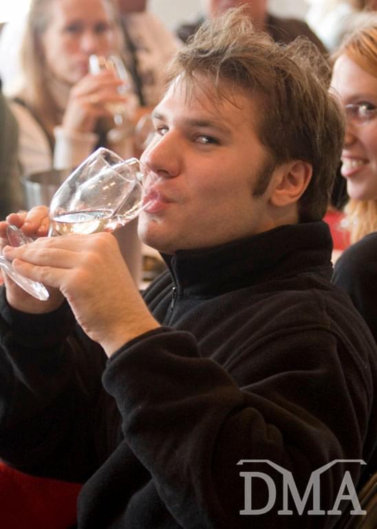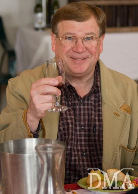 Harold McElraft swirls his wine and toasts the camera before sampling