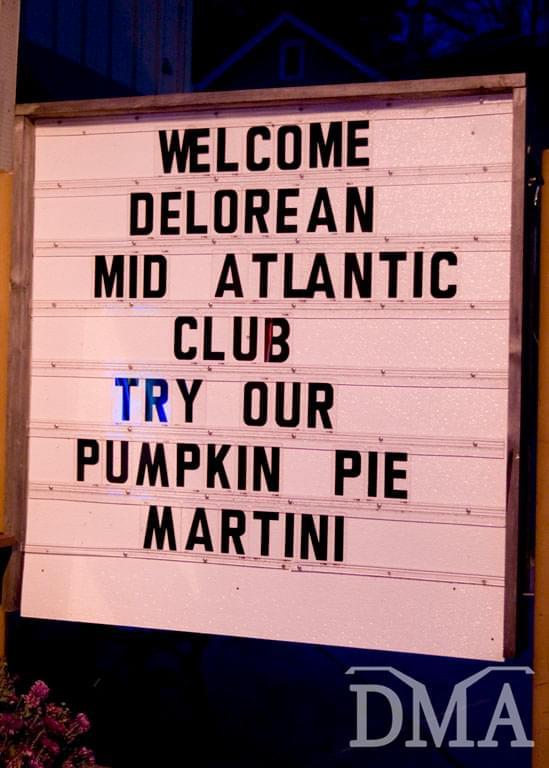 The sign outside the restaurant says it all... DeLoreans and Pumpkin pie Martinis. How could you go wrong?