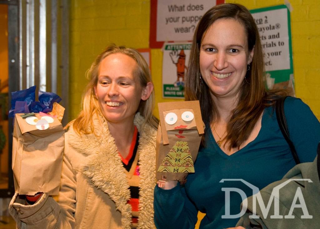 Chris Koncelik and Shari Deutsch take time to make their own paper bag puppets