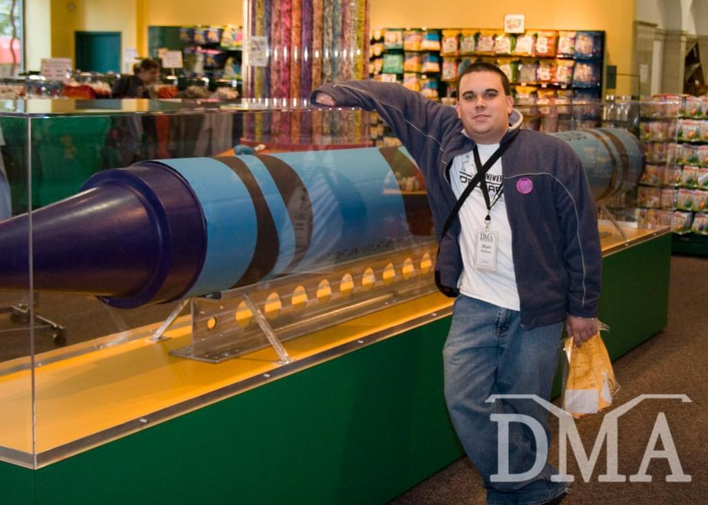 Matt Williams stands next to the worlds largest Crayon. YES... IT'S REAL! It was created from leftover blue crayon scraps donated by children all over the world